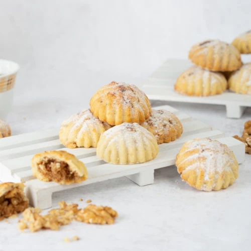 Walnut Maamoul from Dates and Wheat – made with wheat flour and filled with toasted walnuts blended with a hint of aromatic cinnamon. A warm, comforting flavor that brings together the crunch of nuts and the cozy spice of cinnamon in a timeless treat.