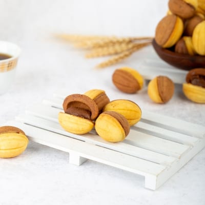 Crunchy biscuit with a rich flavor, filled with smooth caramel or delicious chocolate.